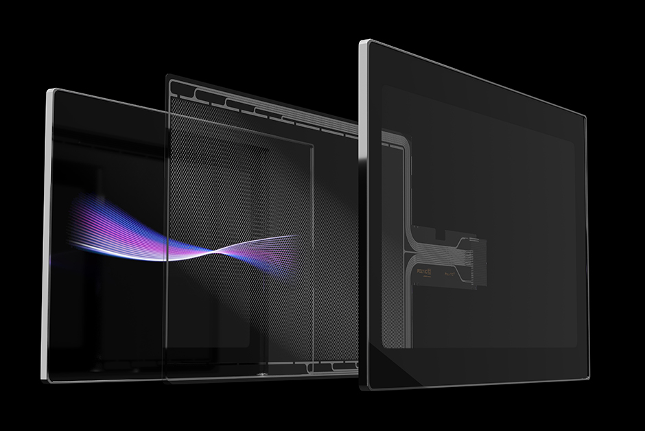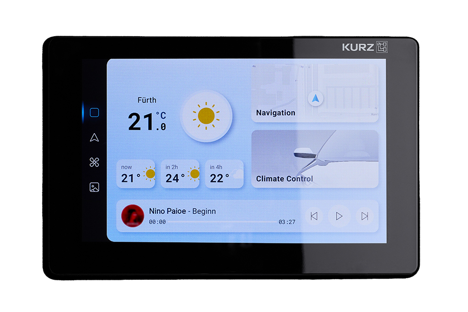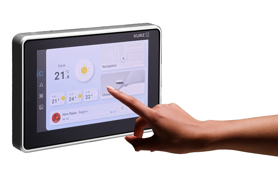 Instead of expensive glass panels, the cooperation partners opted for plastic displays, which are more cost-effective to produce thanks to efficient technologies. Different variants were produced in which the touch sensors are laminated. Alternatively, it is also possible to inject the sensors. Touch operation is possible with all versions, just like with conventional glass displays. The panel of these display stacks is manufactured and coated by KURZ using the IMD (In-Mold Decoration) process, with polycarbonate (PC) as the panel material in injection molding. PolyTC® sensors from KURZ subsidiary PolyIC and, in some cases, other optical filter foils are integrated on the back of the display.